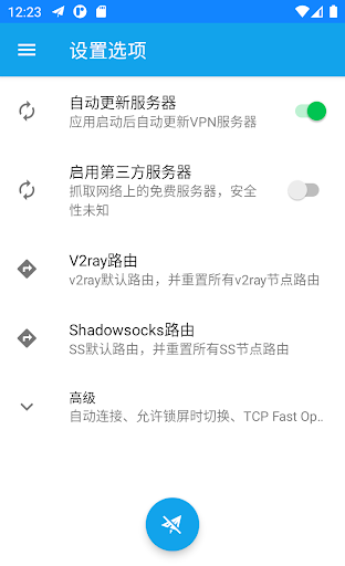 無限流量的安卓版V2ray VPN, 基於V2ray/vmess/vless/shadowsocks加密協議。 APP內置幾個自建的VPN伺服器並自動抓取大量網路免費V2ray/vmess/shadowsocks伺服器,這些網路免費伺服器中包含很多無效伺服器,因此在啟動VPN之前,請單擊右上角的三點按鈕,然後執行“測試全部配置真連接”,然後執行“刪除無效/按組排序”和“按測速結果排序”,然後單擊選擇一個伺服器,被選中的伺服器的左邊框顏色將與其它伺服器顏色不同,最後單擊底部的圓形按鈕(小飛機按鈕)以啟動VPN連接。注意:網路免費伺服器來自網路分享,為方便網友而自動抓取,我們不保證其可靠性和安全性。