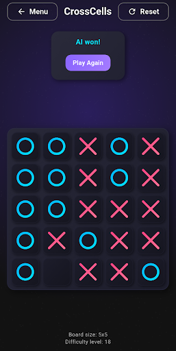 CrossCells 透過現代功能和更深層的遊戲玩法重新構想了經典的井字遊戲體驗。在激烈的比賽中與智慧人工智慧對戰或挑戰第二名玩家,考驗策略和注意力。使用不同的棋盤尺寸和 AI 難度等級自訂您的體驗,讓每款遊戲都煥然一新,並根據您的技能水平量身定制。無論您喜歡快速的 3x3 戰鬥還是更大、更具戰略性的棋盤,CrossCells 都能滿足您的風格。